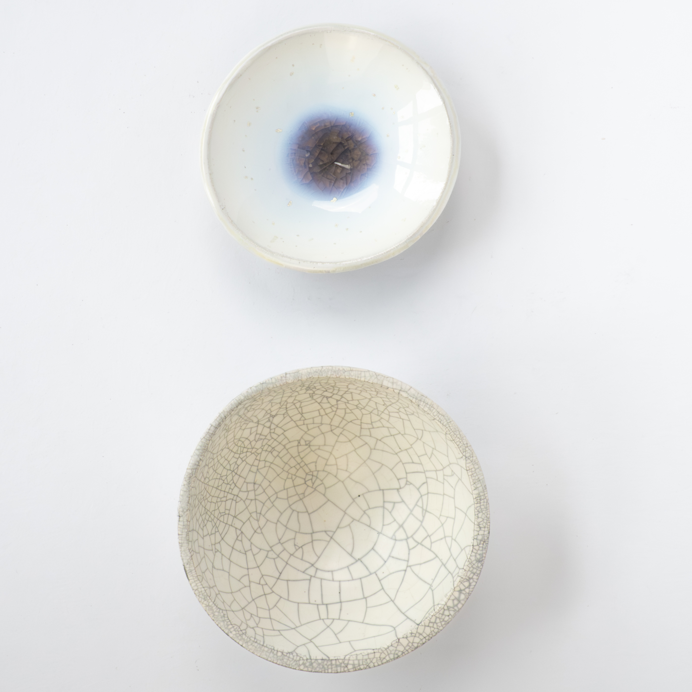 - 1050°C: Silkeblød satinmat overflade med fine krakeleringer (craquelé-effekt). Krakeleringsmønstret kan fremhæves efter brænding ved at gnubbe blæk, tusch eller sort te ind i revnerne.