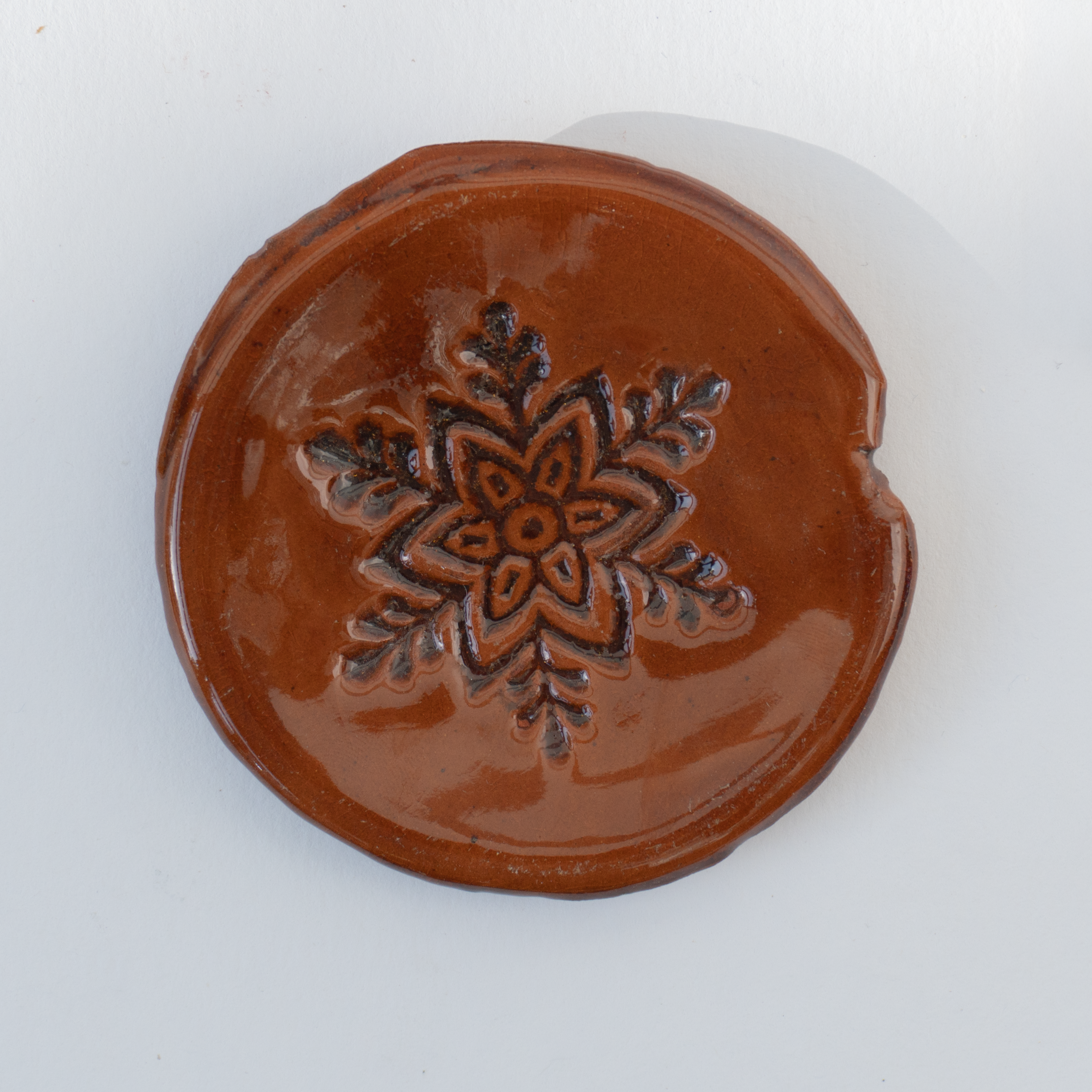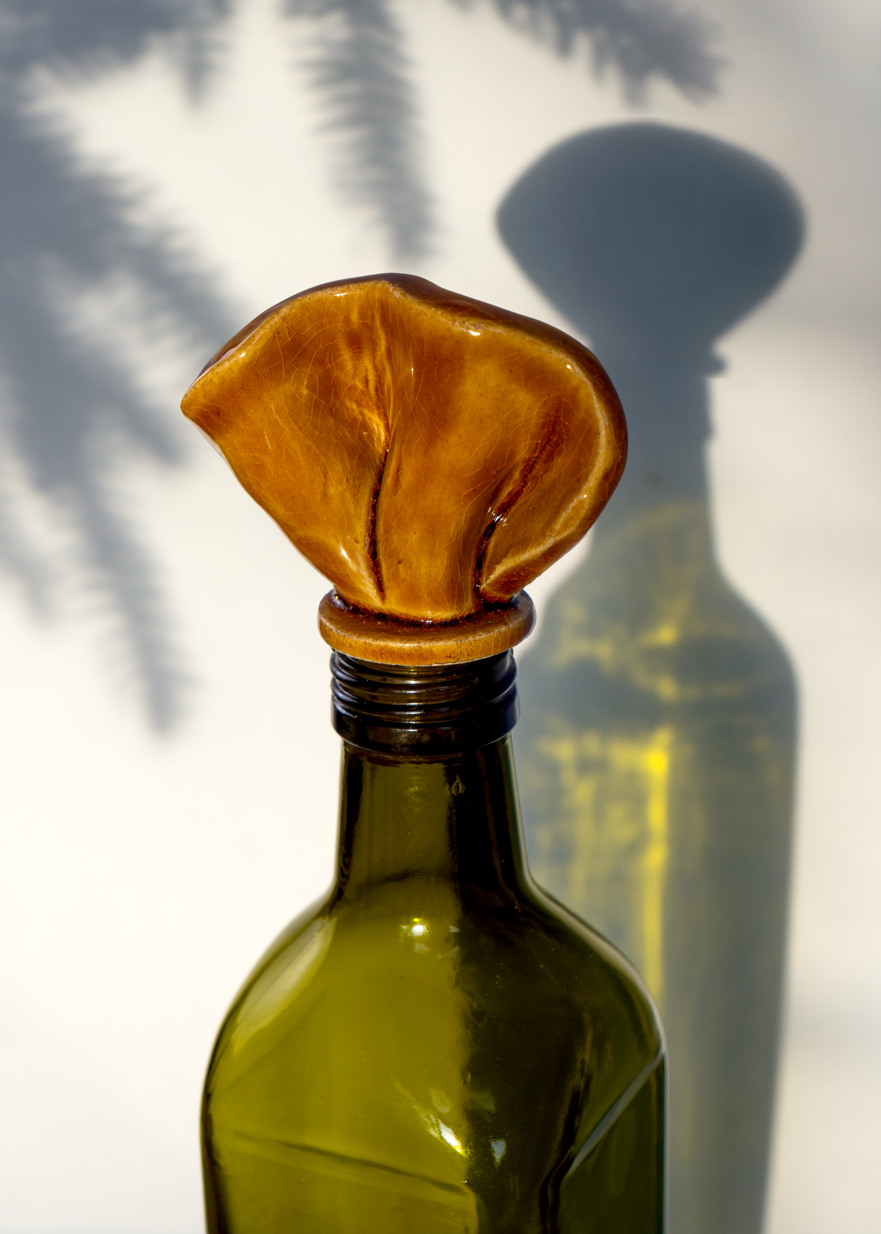 Glasuren giver en blank og varm cognac-farvet overflade med let transparens, hvor lerets egen farve kan skinne igennem.