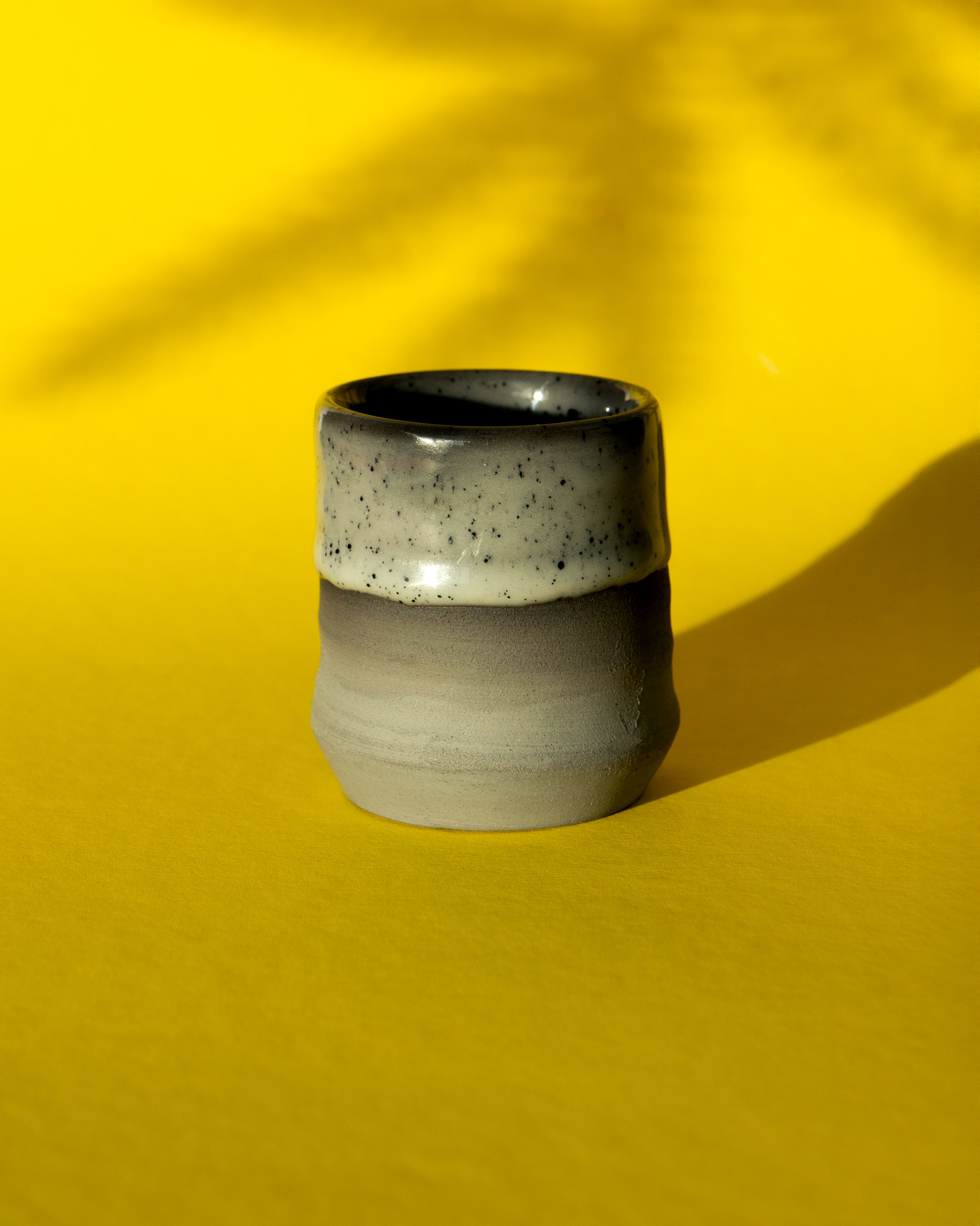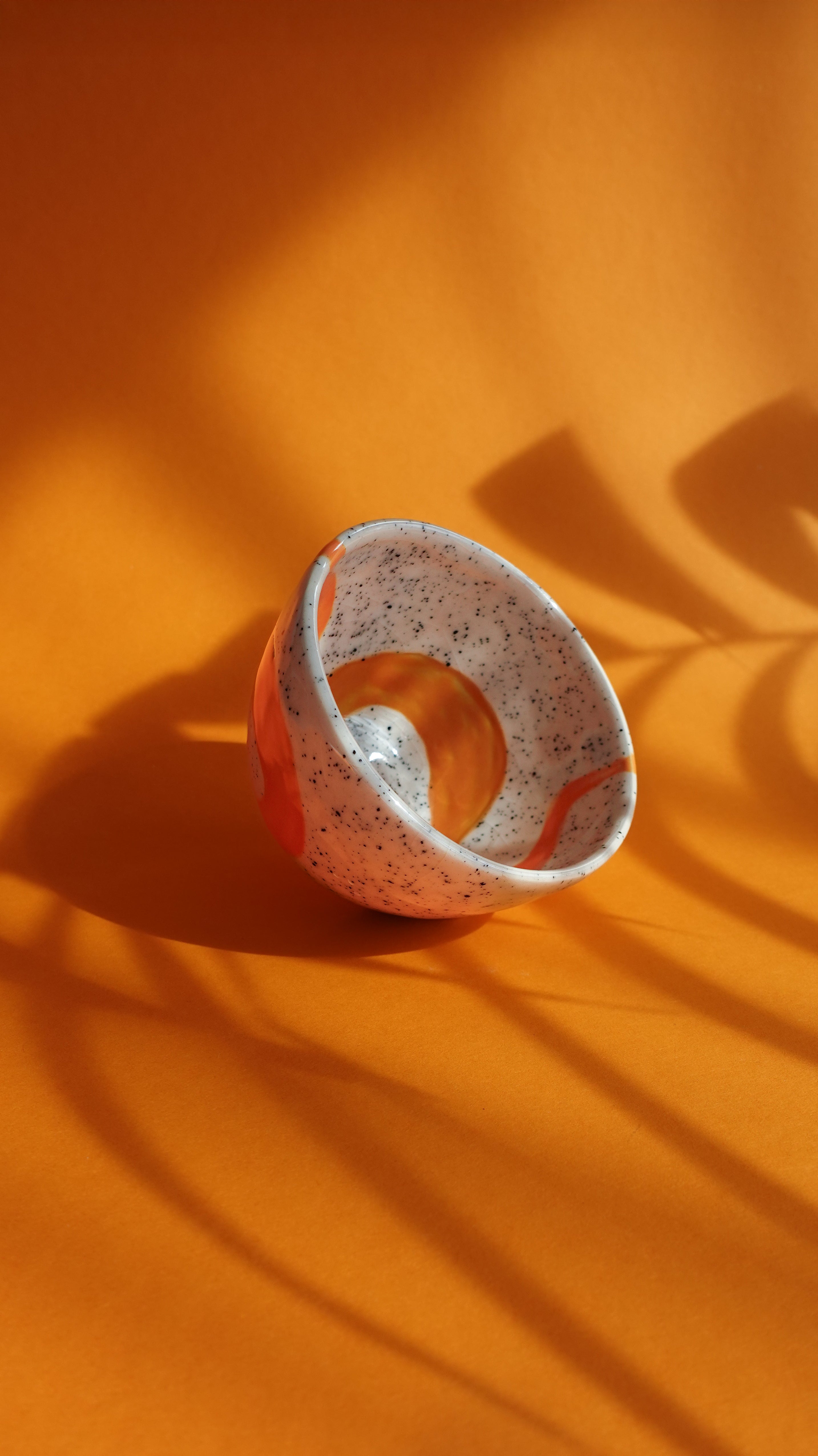 Finish: Blank, transparent glasur med fine sorte prikker. -