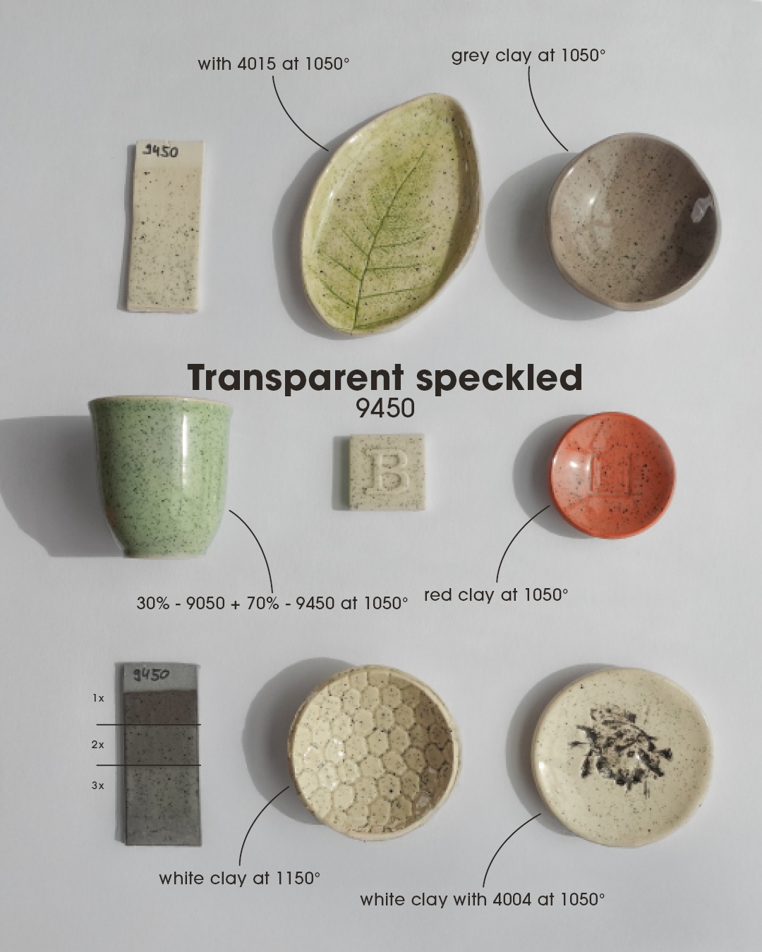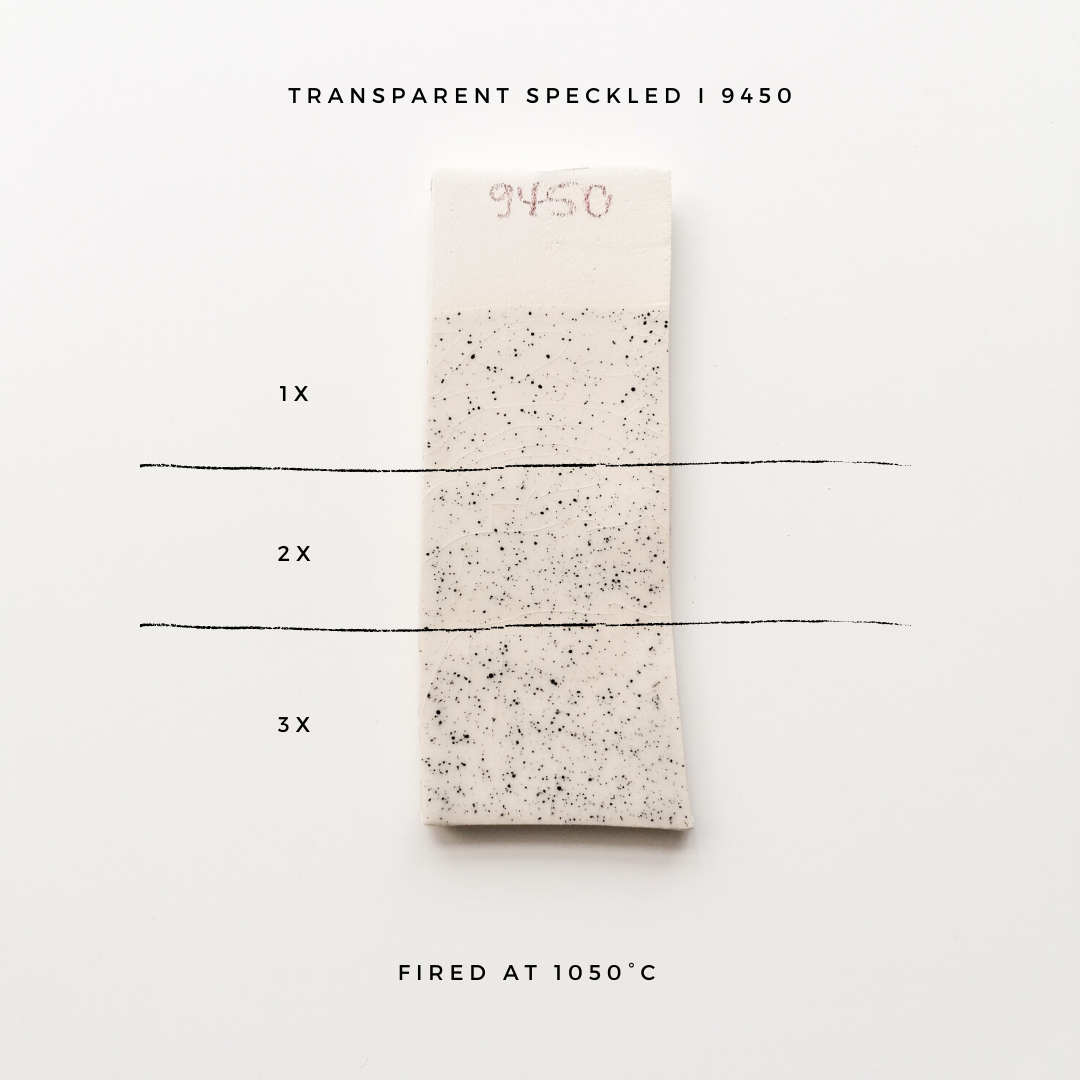 9450 Transparent Speckled er en blank, transparent penselglasur til lertøj med fine sorte prikker. Glasuren giver en klar og glansfuld overflade, hvor de små mørke prikker skaber et levende og dekorativt udtryk.