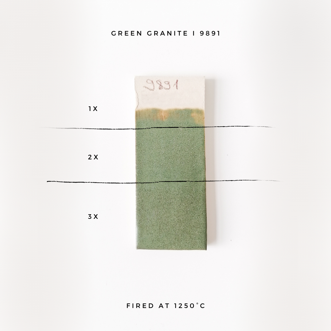 9891 Grøn Granit er en satinglansfuld grøn stentøjsglasur med effekter. Glasuren giver et naturligt udtryk, der varierer smukt med brændingstemperaturen. Den er let at arbejde med og egner sig til både dekoration og større flader på stentøj.