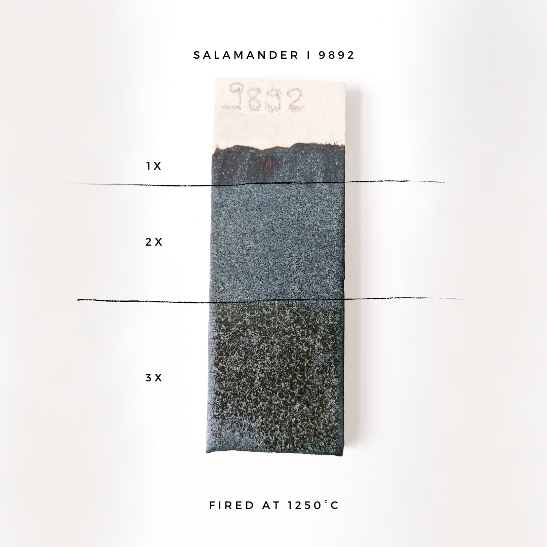 9892 Salamander er en satinglansfuld sortgrå stentøjsglasur med sennepsfarvede fine pletter, som arrangerer sig som skel-lignende aftegninger. Glasuren giver et naturligt udtryk, der varierer smukt med brændingstemperaturen. Den er let at arbejde med og egner sig til både dekoration og større flader på stentøj.