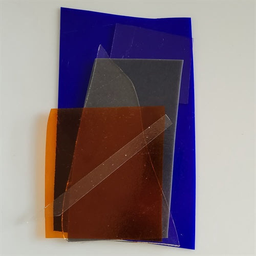 Klart glas, mørkeblå opak, rød transp, grå opak, lavendelblå transp