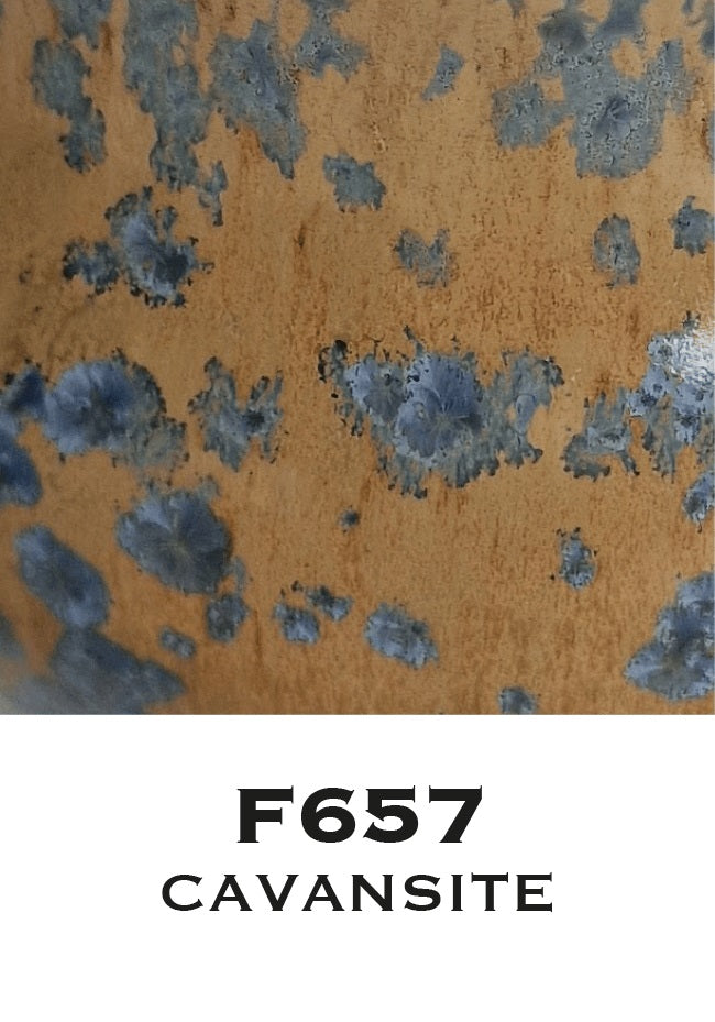 F657 Cavansite er en krystalglasur til porcelæn og stentøj. Under brændingen danner glasuren tydelige krystaller, som giver et levende spil af mørke, transparente og lysere nuancer. Ingen to brændinger bliver helt ens – og det er netop dét, der gør krystalglasur så unik og særlig. Glasuren er nem at arbejde med og egner sig både til dekorative detaljer og fuld overfladedækning.